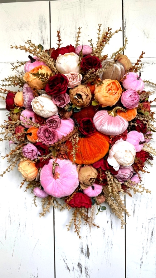 Bring a bold, romantic twist to fall decorating with my velvet pumpkin and peony wreath, a one-of-a-kind design from Wisp and Wonder Designs. This lush wreath combines handcrafted velvet pumpkins in shades of pink, orange and taupe with realistic silk peonies, roses, and ranunculus blossoms in soft pink, ivory and deep burgundy. The result is an enchanting mix...Dimensions: 30x20x8