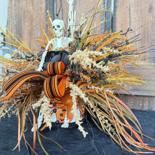 Whimsical Fall Scarecrow Wreath Video Add Spooky Whimsy to Your Halloween Decor Looking for something quirky and fun this Halloween? This handmade skeleton centerpiece brings just the right mix of creepy and cheerful! After all, I designed it to make your guests laugh and maybe jump just a little! A cheerful skeleton waves from a bed of faux fall florals, black...Dimensions: 18x22