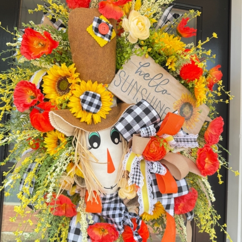 Whimsical Fall Scarecrow Wreath Video Handmade Autumn Door Decor for Your Front Porch Celebrate Fall With Whimsy Welcome in the fall season with this whimsical scarecrow wreath! It's cheerful, warm, and full of seasonal charm. The design features a hand-sewn scarecrow nestled among faux sunflowers, pumpkins, ribbons, and vibrant greenery. For example, it pairs beautifully with warm-toned mums or hay bales on...Dimensions: 32x24x8