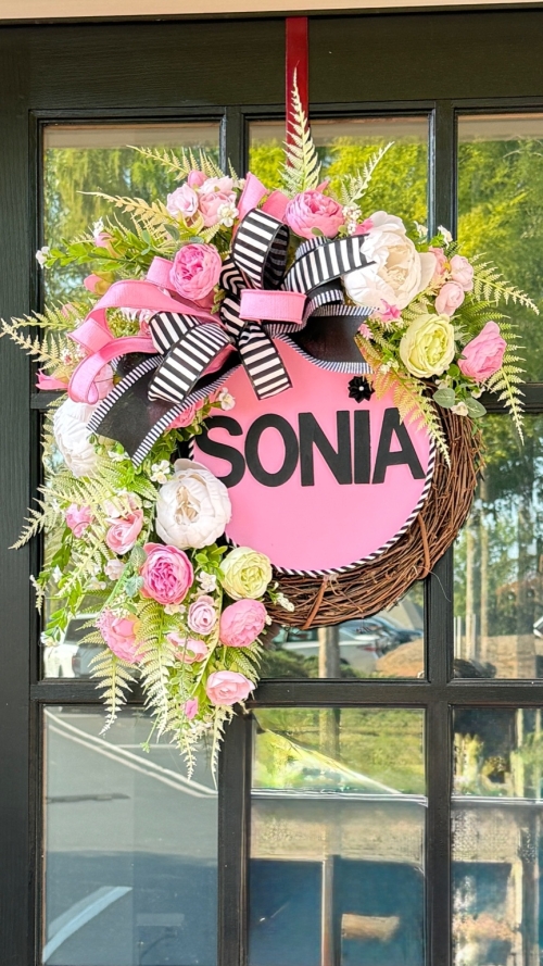 Custom Pink Peony and Greenery Wreath Reserved for Sharon Product Description: This custom floral wreath has been lovingly designed and reserved especially for Sharon. Featuring a handcrafted pink wooden sign with bold black lettering, this wreath is adorned with layers of romantic silk peonies, roses, and ranunculus blossoms in soft shades of blush, white, and pale green. The playful black...Dimensions: 28 inches from tip to tip with ribbons extended x 20 inches