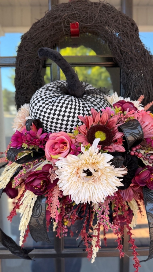 Product Description The Moody Bohemian Harlequin Pumpkin Wreath brings a perfect balance of dark romance and artistic flair to your front door. Designed on a rich black moss base, this handcrafted wreath layers lush textures and colors for an unforgettable statement. Burgundy, blush and cream florals blend with deep plum accents and wisps of amaranthus. At the heart of this design, a...Dimensions: 22x17x9